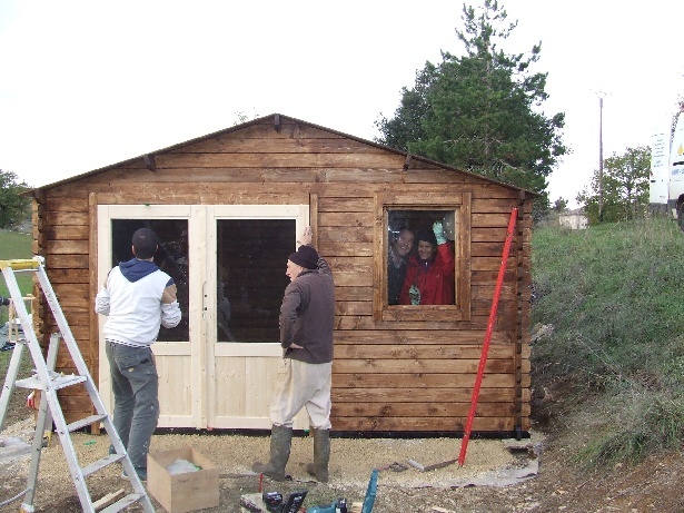 Donc, dans la bonne humeur, on a barbouillé de la lasure, cherché en vain à comprendre la notice aussi absconde qu’un traité fiscal international, assemblé toutes les pièces parfaitement ajustées et, quand le soleil a commencé à tirer sa révérence et décidé de plonger derrière la colline … ce petit paradis était en place. La porte ferme à clef, la toiture semble étanche et le total présente une fière allure. Il ne reste plus qu’à aller chercher les locataires qui ont été provisoirement répartis chez divers volontaires du club pour encombrer garage et dépendances.