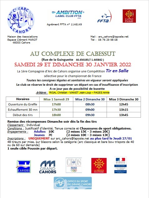 Samedi 29 Janvier et Dimanche 30 Janvier la Première Compagnie d’Arc de Cahors organise un Tir en Salle sélective pour le Championnat de France.